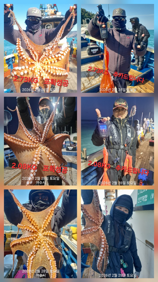 | 제목 : 돌문어 토요일 전투출항 선비8만원 출항합니다. 대물돌문어 뽑으러 가실분 연락주세요. 연일 대물돌문어 쭉쭉 뽑고 왔습니다. 묵직한 손맛 즐기실분 연락주세요. 심해갑오징어 월요일부터 자리여유 많습니다. 평일11만원 할인중입니다. 출조하실분 미리 예약부탁드립니다. 감사합니다 | ||